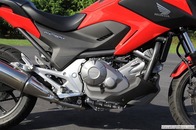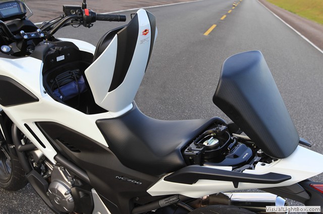 Quando vi esta moto pela primeira vez no Salão de Milão de 2011 (EICMA 2011), não imaginei que em menos de um ano ela já estaria sendo produzida na fábrica da Honda em Manaus. Na ocasião, naquele estande lotado, não pude perceber todos seus atributos, mas me chamou a atenção seu motor compacto com dois cilindros numa inclinação de 62 graus. Somente aqui, ao conhecê-la melhor, descobri que no tradicional lugar do tanque de combustível havia um compartimento para acomodar um capacete ou uma pequena mochila! E é no potencial diferenciado desta moto que a Honda aposta, ao lançá-la e comercializá-la a partir de julho. Quem pretende utilizar a motocicleta no dia-a-dia com certeza irá aprovar seu exclusivo porta-capacete localizado onde tradicionalmente é o tanque de combustível. Este compartimento deve agradar seu proprietário, visto que se torna o substituto ideal das pesadas mochilas e baús. Praticidade esta que só foi possível graças ao posicionamento de seu moderno motor.